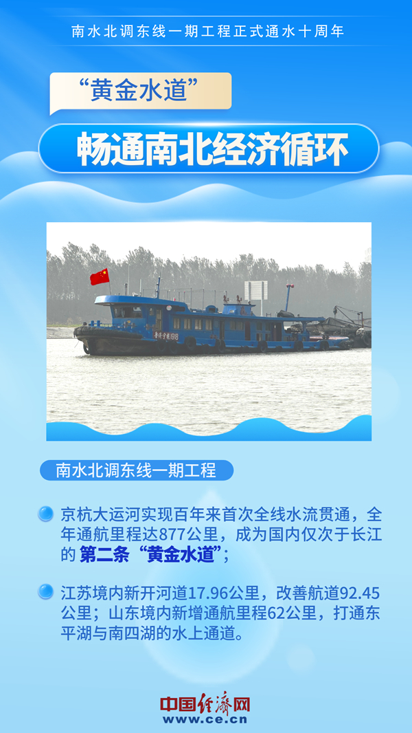 2002年,京杭大运河被纳入南水北调东线工程。2022年,京杭大运河实现百年来首次全线水流贯通。受益于东线一期工程的水量保障,目前京杭大运河的全年通航里程达877公里,大大提高了区域水运能力,成为国内仅次于长江的第二条“黄金水道”。