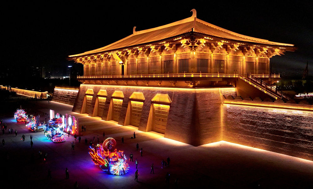 巡游彩车从西安大明宫国家遗址公园丹凤门前驶过(2023年9月30日摄,无人机照片)。新华社记者 刘潇 摄