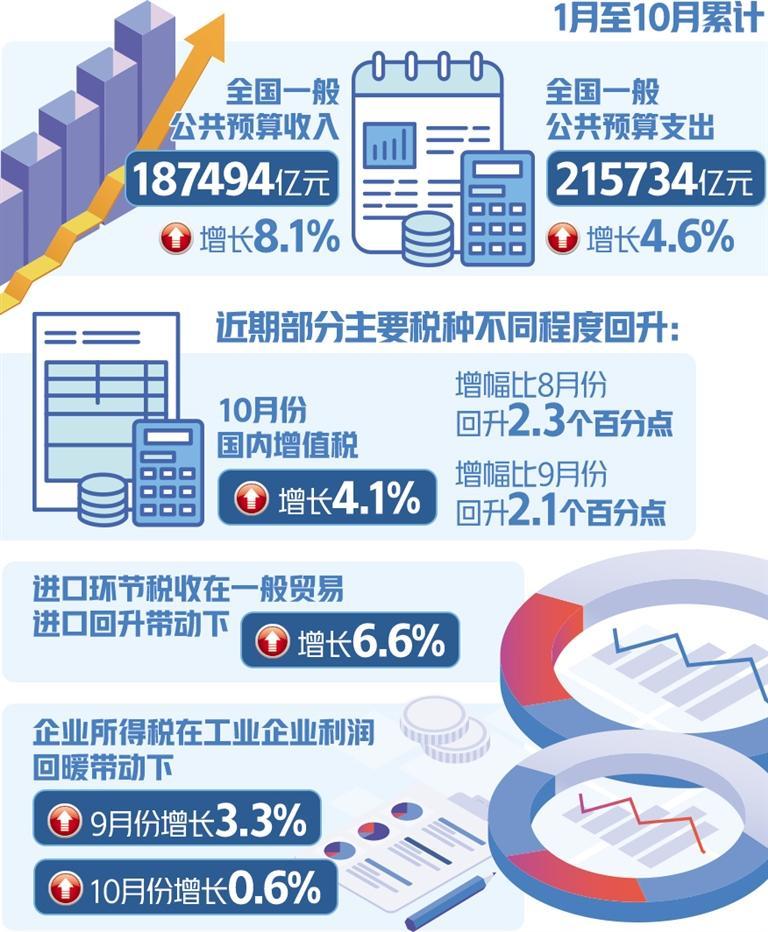 财政收支是经济运行的“晴雨表”。国家统计局最新发布数据显示,10月份多数生产需求指标同比增速回升,就业物价总体稳定,经济运行延续恢复向好态势。“部分主要税种呈现不同程度的回升,反映我国财政收入‘含金量’较高,特别是市场活力进一步恢复,经营主体运行质量与效益逐步回升。”李旭红说。