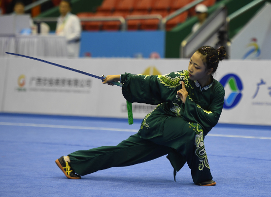 11月7日,天津选手王梦甜在第一届全国学生(青年)运动会中学组女子自选太极剑决赛中获得冠军。新华社记者 侯昭康 摄