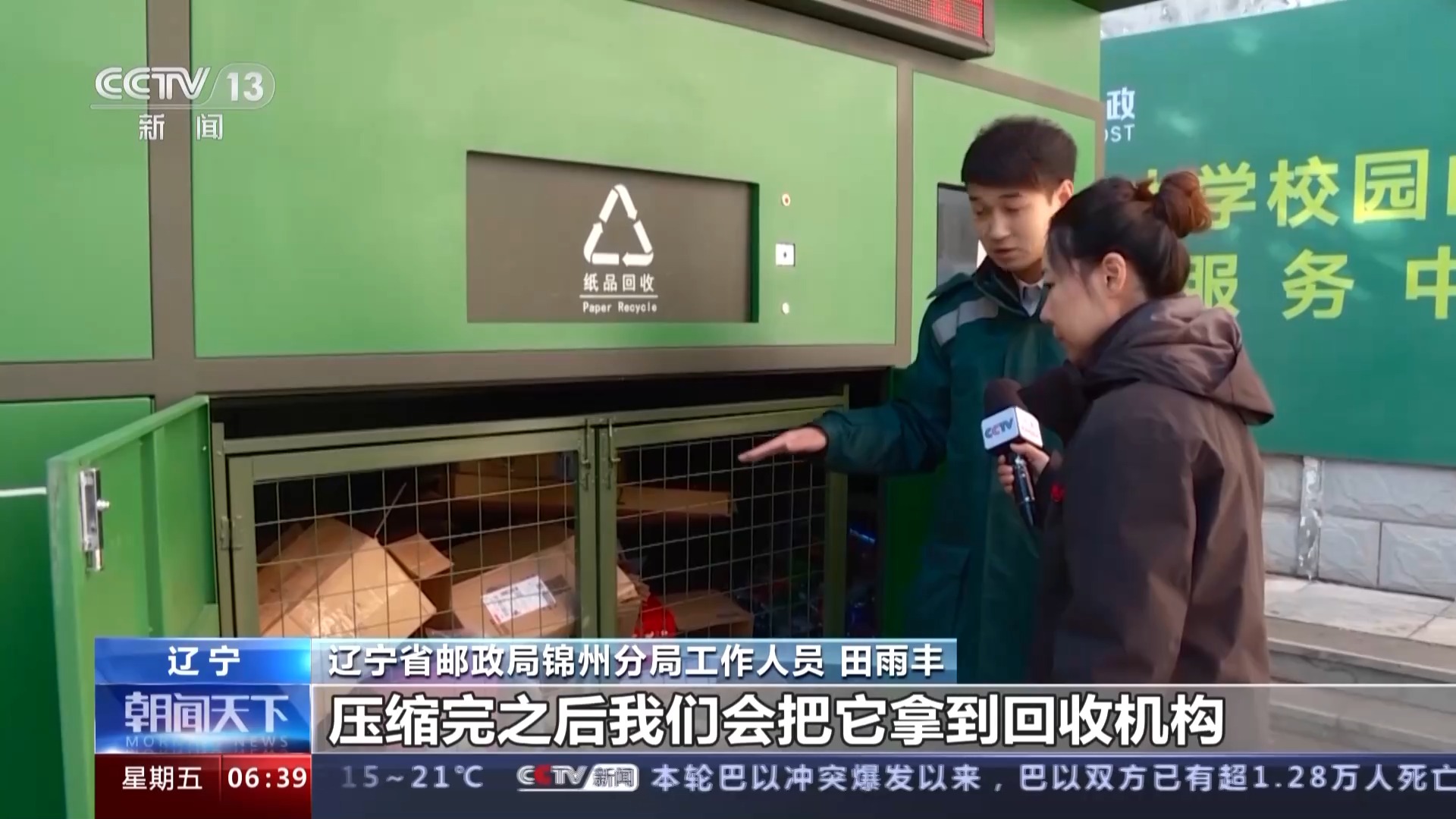 在辽宁锦州渤海大学校园内的邮政快递点门前,刚刚投入使用的绿色回收箱是由辽宁邮政和锦州渤海大学联合研发的瓦楞纸箱智能化回收装置,除了纸箱外还能回收书刊、塑料瓶。