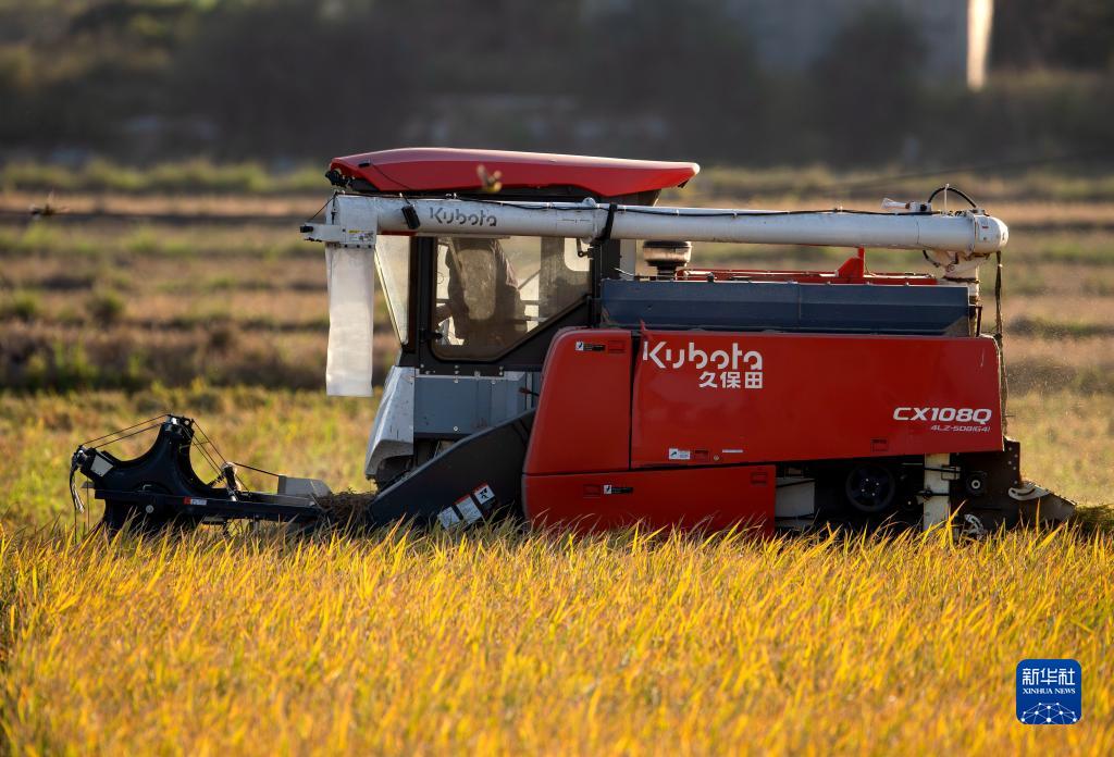 连日来,在福建省石狮市湿地公园粮食规模化种植示范基地,金黄的晚稻成块连片。趁着晴好天气,水稻种植户们忙着收割水稻。