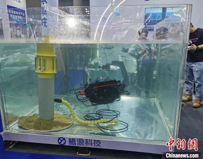 展区技术人员一边演示水下机器人一边向记者介绍,“我们的水下机器人具有独创的AI视觉锁定功能,可以在水下作业时及时修补渔网,维护渔场设备,提高水产养殖质量。”