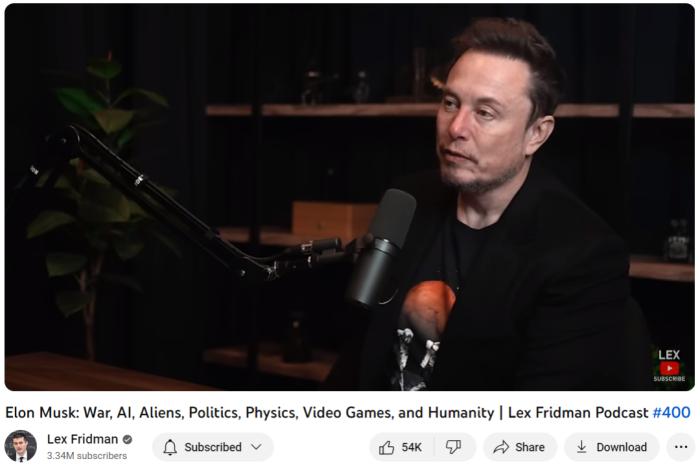 Lex Fridman新上线一期节目,嘉宾马斯克(Elon Musk),这也是马斯克第四次接受Lex Fridman的访谈。