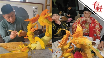 11月21日,山东烟台一居民为侄女的迎亲宴制作果蔬雕刻作品的视频走红网络。制作雕刻作品的张先生表示,自己耗时一天为侄女雕刻出南瓜版的“龙凤呈祥”,希望一对新人能够百年好合。