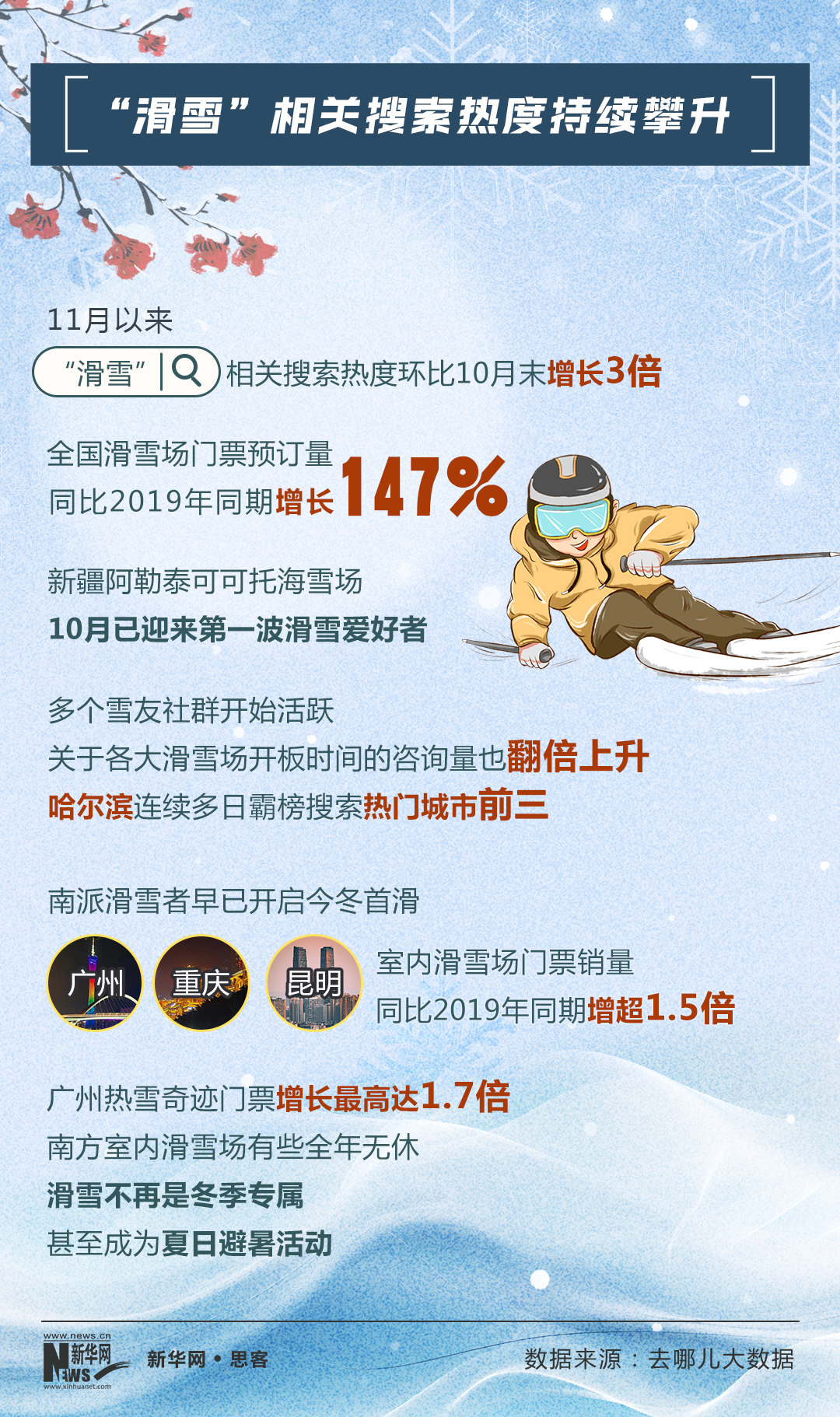 去哪儿大数据显示,广州、重庆、昆明室内滑雪场门票销量同比2019年同期增超1.5倍,广州热雪奇迹门票增长最高达1.7倍。与等待开板的室外滑雪场不同,南方室内滑雪场有些全年无休,滑雪不再是冬季专属,甚至成为夏日避暑活动。