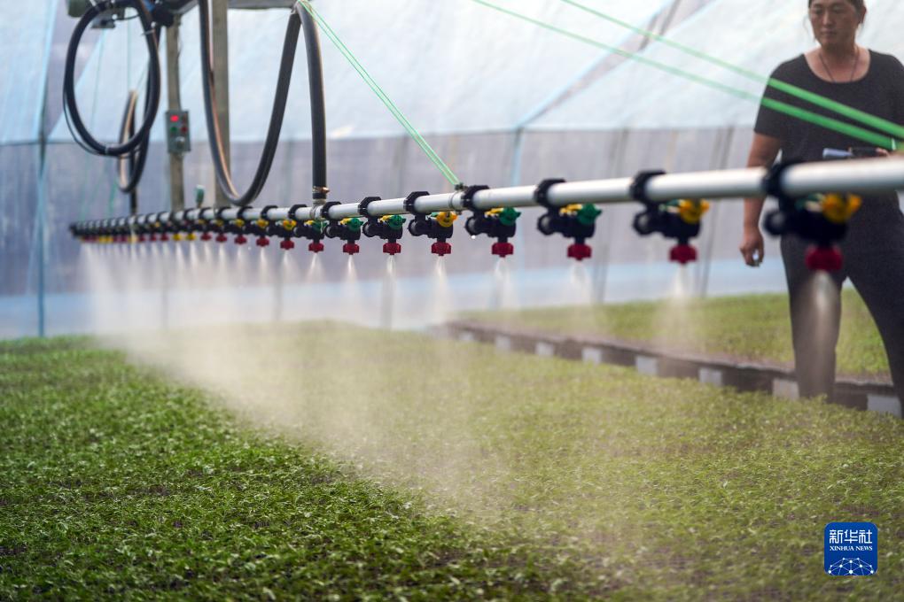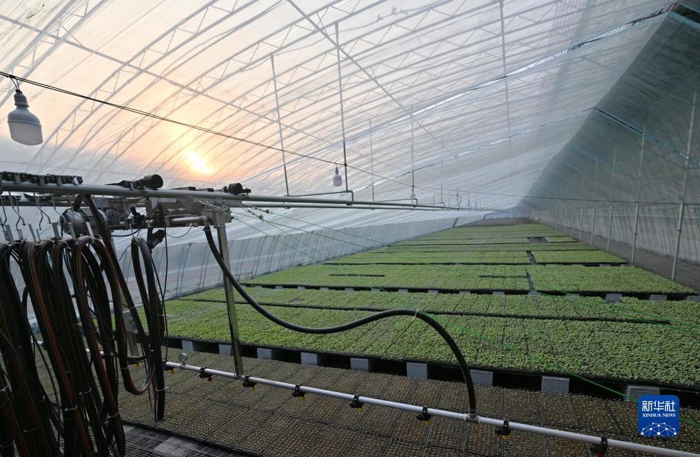 在饶阳县大尹村镇南北岩村一个新建的全钢架无立柱新型日光温室里,自动喷淋装置正在给西红柿幼苗浇水(11月20日摄)。新华社记者 陈晔华 摄