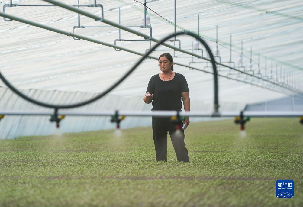 饶阳县大尹村镇南北岩村众瑞合作社社长杨姗姗在新建的全钢架无立柱新型日光温室里遥控操作自动喷淋装置给西红柿幼苗浇水(11月20日摄)。新华社记者 陈晔华 摄
