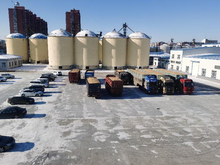 黑龙江立呈大豆蛋白有限公司厂区内,送粮的车辆等待卸车。新华社记者孙晓宇 摄