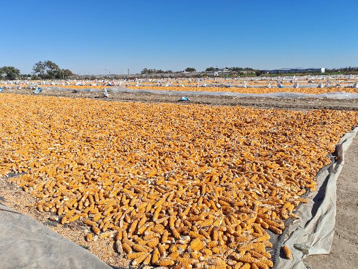 新疆昌吉回族自治州奇台县晾晒场上等待脱粒交售的玉米。新华社记者苟立锋 摄
