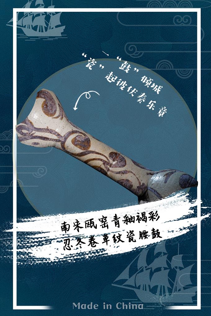 南宋瓯窑青釉褐彩忍冬卷草纹瓷腰鼓