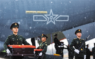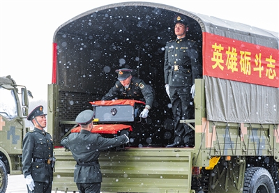 11月23日,沈阳,礼兵手捧烈士棺椁登上卡车。