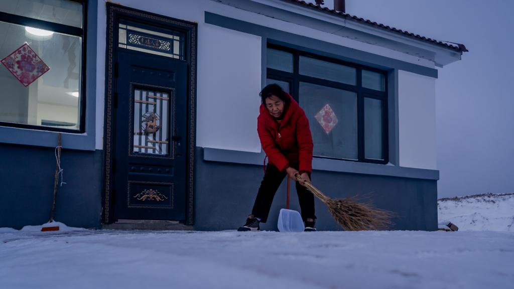 11月23日傍晚,开原镇新开村村民徐中仁在新房子门前清扫积雪。新华社记者唐成卓 摄