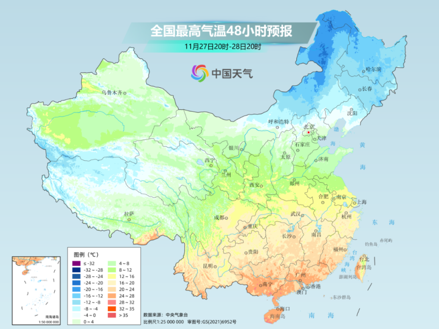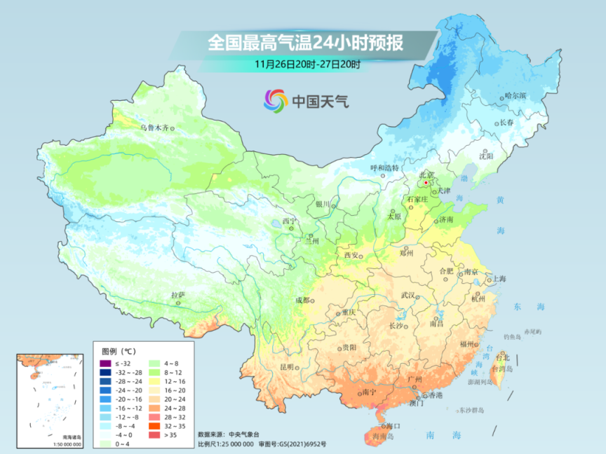 而在长江沿线不少地方,明天冷空气尚未抵达时,气温还将有所回升。下周中后期,随着冷空气接连南下,气温也会降至低谷。预计30日前后,最高气温20°C线将回落到江南南部和华南北部一带。