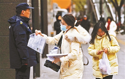 昨日一早,在中关村中学双榆树校区的考点,门前已经聚集了很多考生。虽然天寒地冻,但考生们还是不愿放下手中的复习资料,仍在抓紧最后的时间强化记忆。几家公务员考试培训机构在门口发放宣传资料,一些考生手里握着“宝典”“备忘录”等复习资料,在做最后的强化记忆。金砖扩容、杭州亚运会、神舟十六号……在一名考生的押题手册上,北京青年报记者看到,国家重大时事成为考生们心中的必考题目。