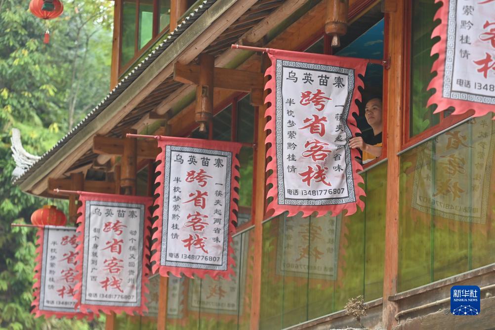 乌英苗寨村民吴新仁整理窗外的民宿招牌(2022年9月11日摄)。吴新仁曾在外打工,多年前回到家乡创业,在村里办起了第一家民宿。