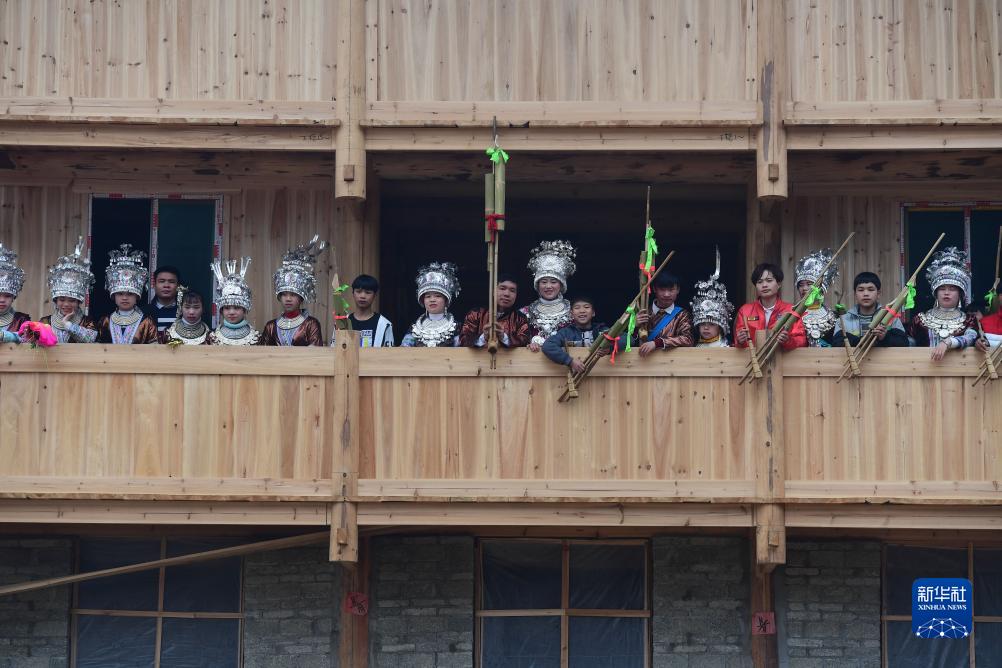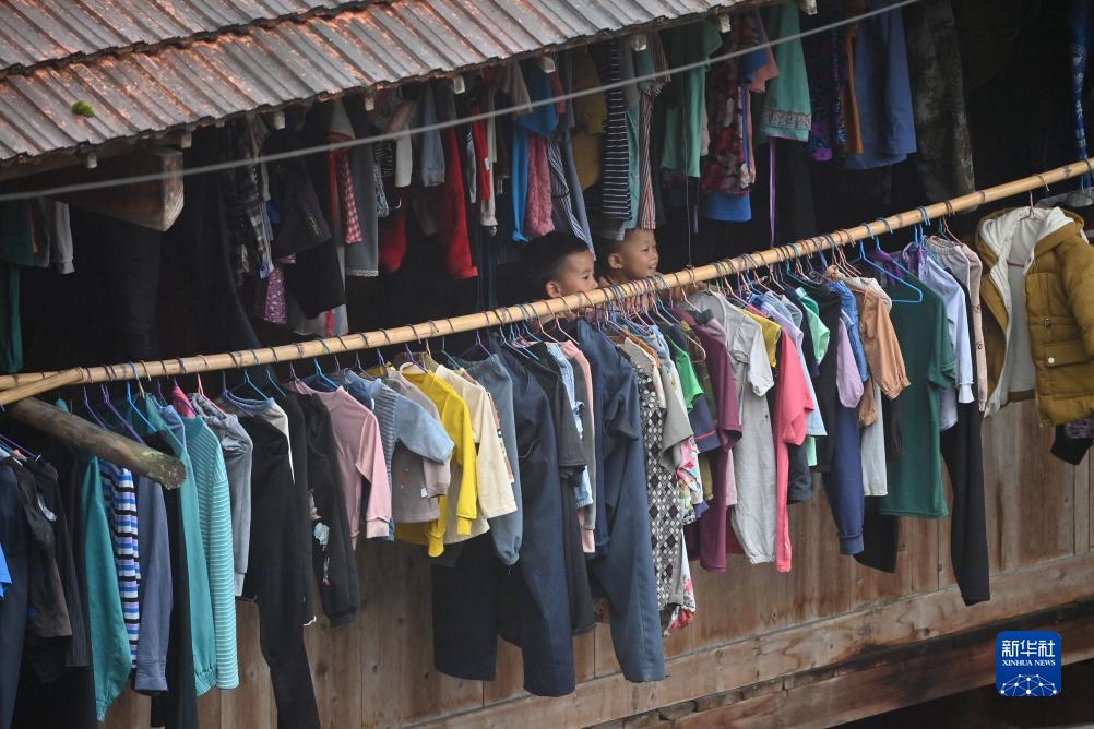 在乌英苗寨,两个小朋友在看窗外的风景(2023年10月14日摄)。
