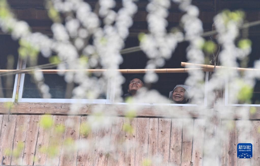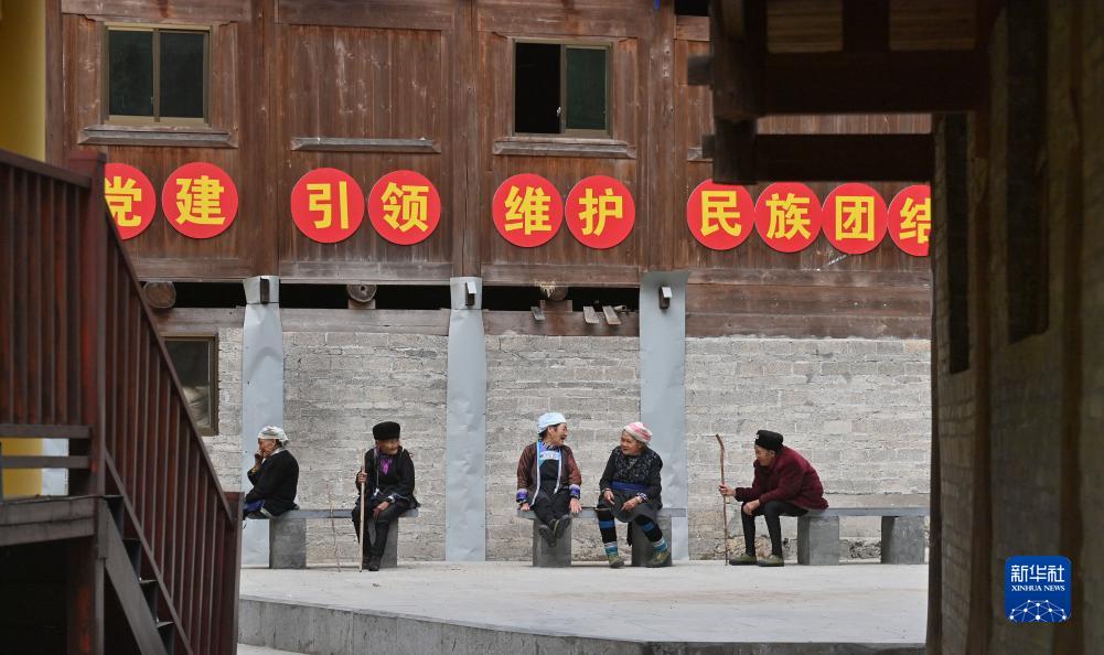 在乌英苗寨,老人们在窗外的小广场上晒太阳(2023年3月15日摄)。