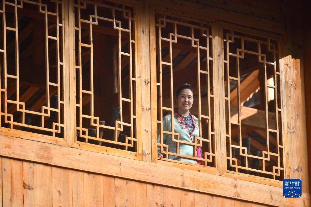 一名乌英苗寨村民从风雨楼里看窗外的风景(2023年10月4日摄)。