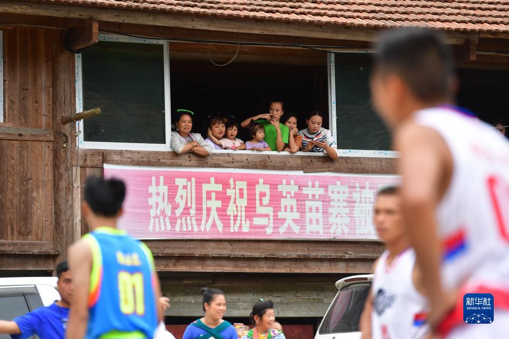 乌英苗寨村民在木楼里观看窗外的篮球比赛(2019年7月19日摄)。