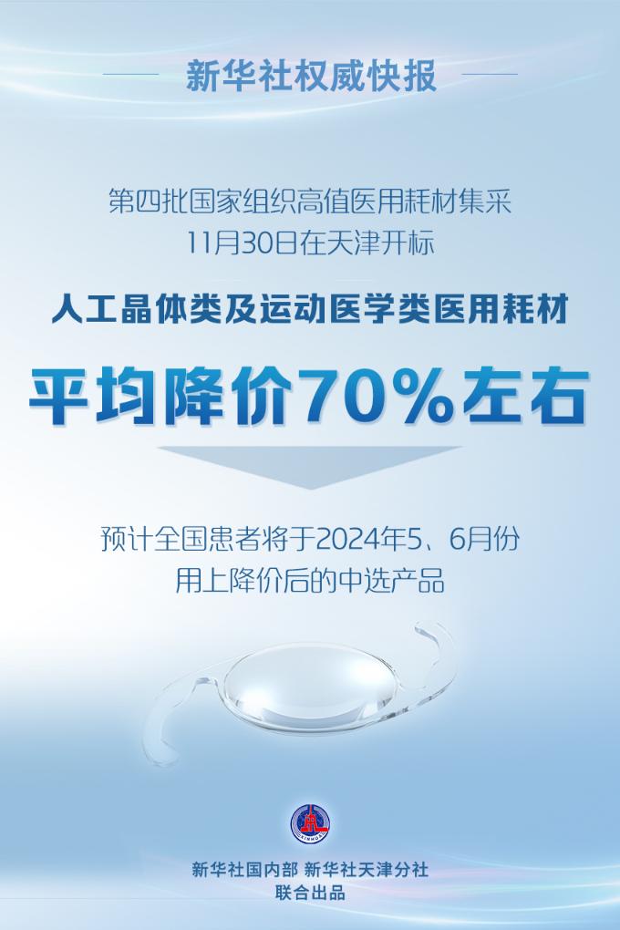 新华社天津11月30日电 第四批国家组织高值医用耗材集采30日在天津开标,并产生拟中选结果。此次集采覆盖人工晶体、运动医学相关高值医用耗材,拟中选产品平均降价70%左右,将广泛惠及接受晶体植入的白内障患者,以及因劳动、运动肌肉韧带受损需施行运动医学手术的患者。