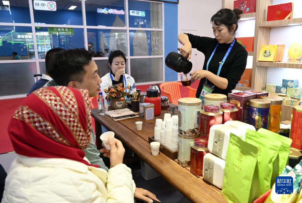 11月30日,在链博会绿色农业链展区,参观者们在中粮集团展台前品茶。