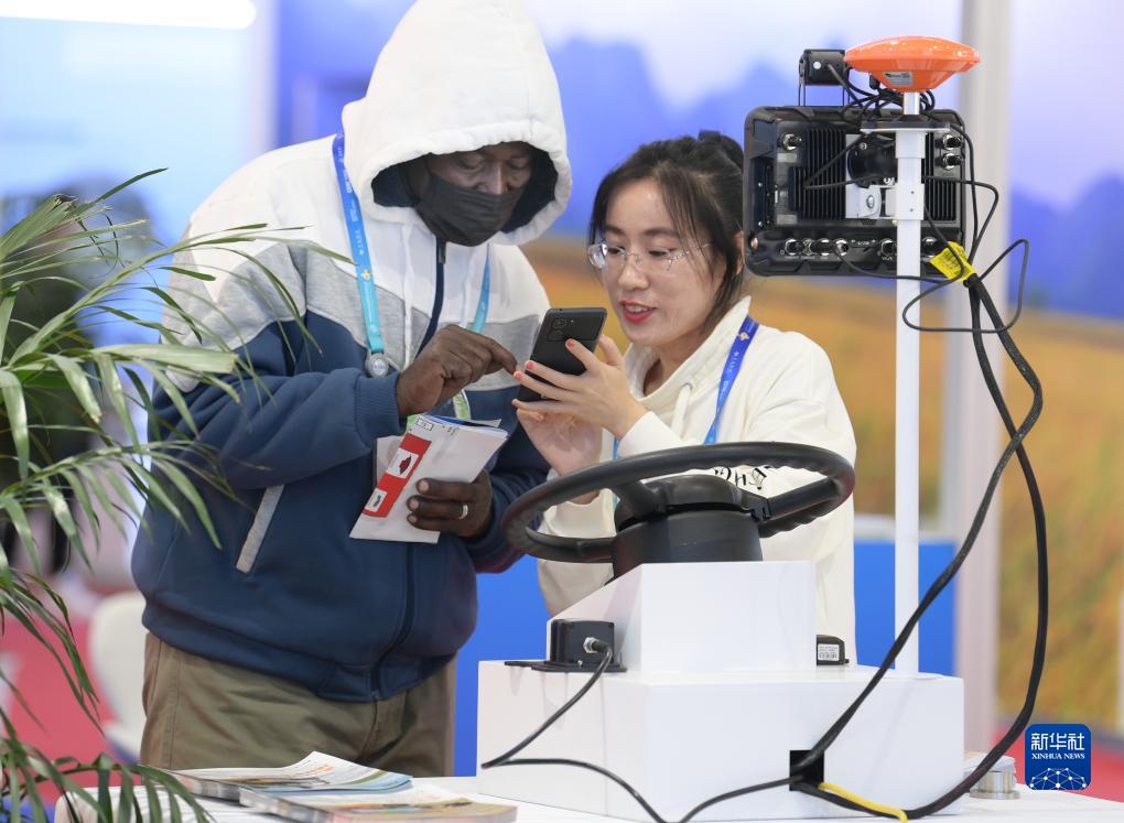 11月30日,在链博会绿色农业链展区,黑龙江惠达科技股份有限公司的工作人员向外国参观者(左)介绍插秧机自动驾驶系统。