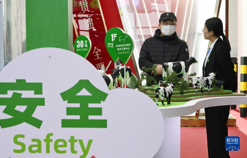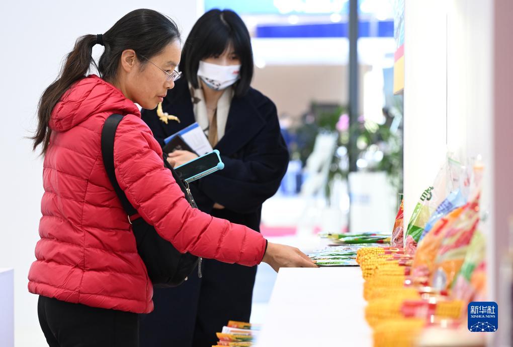 11月30日,在链博会绿色农业链展区,一位参观者(左)在天津食品集团展台前参观。