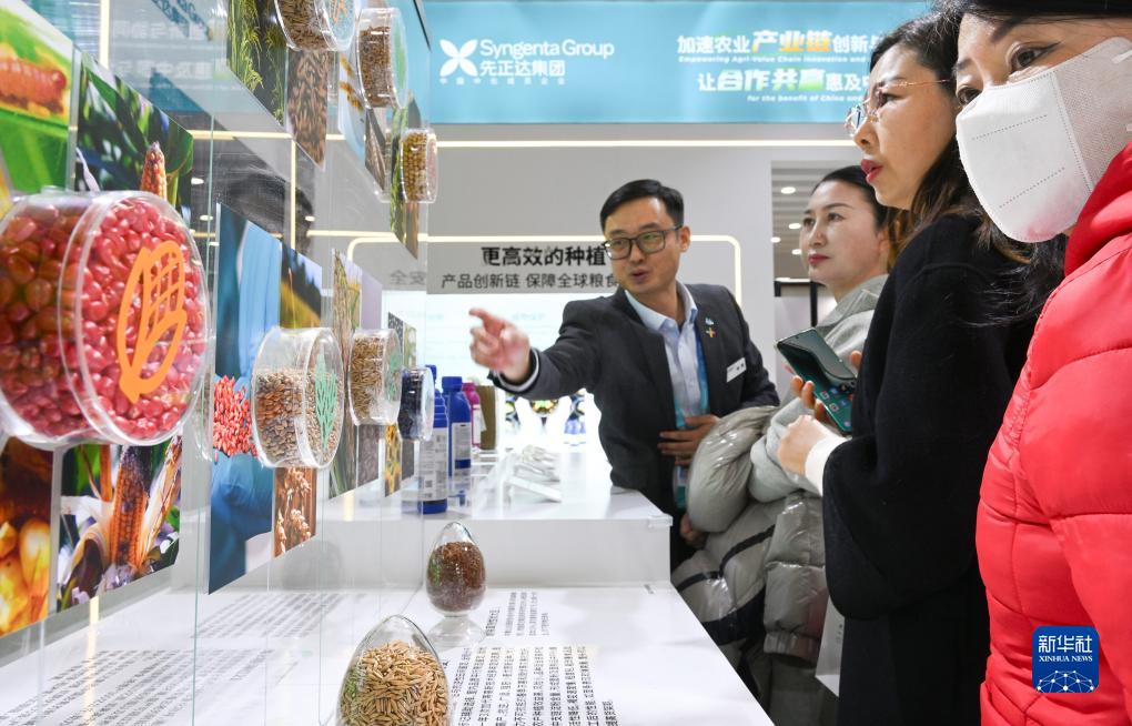 11月30日,在链博会绿色农业链展区,参观者在先正达集团展台前了解种子研发情况。
