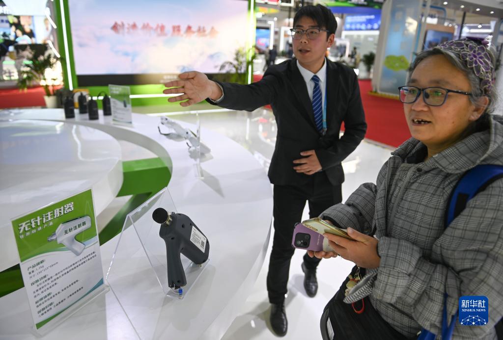 11月30日,在链博会绿色农业链展区,参展商向参观者介绍一款智能设备。