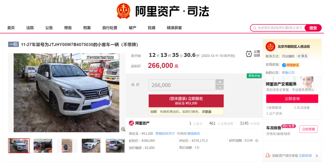 该车辆评估价379175.5元,起拍价266000元,参拍需缴纳保证金53200元,增价幅度为2000元。目前已有1人报名。