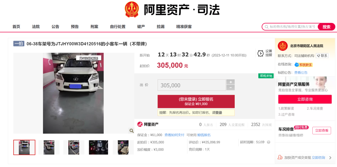 这辆车的评估价为435098.99元,起拍价305000元,保证金61000元,增价幅度为3000元。