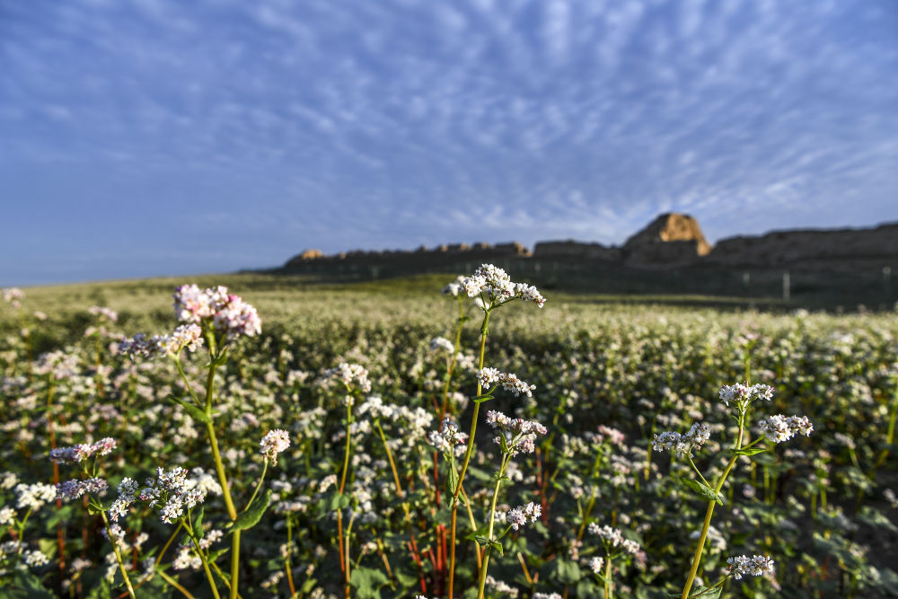 宁夏吴忠市盐池县一处长城脚下荞麦花开放(2023年8月18日摄)。新华社记者 冯开华 摄