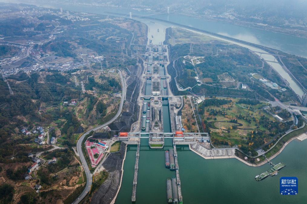 12月1日,船舶有序通过三峡双线五级船闸(无人机照片)。截至11月25日,三峡船闸2023年过闸货运量超1.56亿吨,突破2022年全年货运量历史最高纪录。今年以来,三峡船闸共运行10210闸次,过船39463艘次,通过旅客16939人次。自2003年通航以来,三峡船闸已安全高效运行20年,累计过闸货运量19.96亿吨。