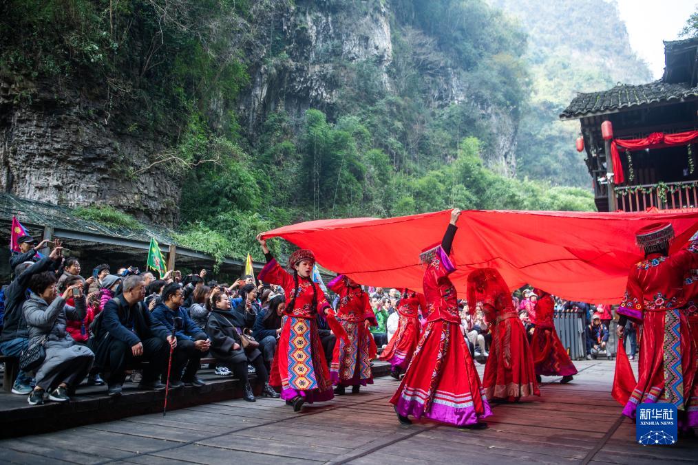 12月2日,在湖北宜昌市夷陵区三峡人家风景区,演艺人员在为游客进行民俗表演。宜昌5A级旅游景区三峡人家依山傍水、风景如画,它以“一肩挑两坝、一江携两溪”的独特地理位置,每年吸引着上百万游人。
