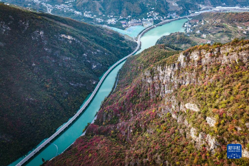 12月2日,汽车行驶在湖北宜昌市兴山县水上公路上(无人机照片)。近年来,宜昌市兴山县推动文旅深度融合,在大山深处描绘一幅高质量发展的美丽画卷。