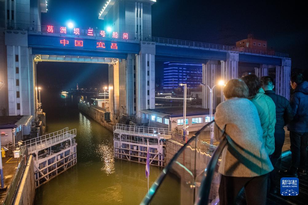 游客乘坐纯电游轮“长江三峡1”号通过葛洲坝三号船闸(12月1日摄)。近年来,湖北宜昌市“长江夜游”将城市景观、水电文化、三峡特色和夜间休闲深度融合,现已成为宜昌旅游的一张亮丽名片。