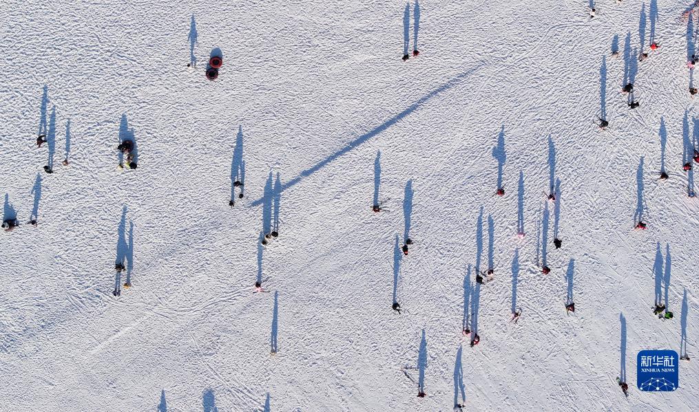 12月2日,游客在银川市阅海滑雪场体验冰雪活动(无人机照片)。新华社记者 王鹏 摄