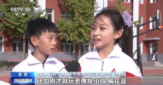 中国人民大学附属中学翠微学校三年级学生 李美周:很多娱乐项目,比如刚才就玩老鹰捉小鸡,编花篮,还有飞盘和弹力球。