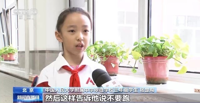 中国人民大学附属中学翠微学校三年级学生 杨楚珣:每周五的时候会有培训。课间的时候楼道内可以玩,但是不可以大声喧哗,也不可以跑。一般看到有同学跑的话就拍一拍他,用手势告诉他说不要跑。如果楼道内有同学大声喧哗就会这样(手势)。如果他们表现很好,我会给他们竖一个大拇指(手势)。