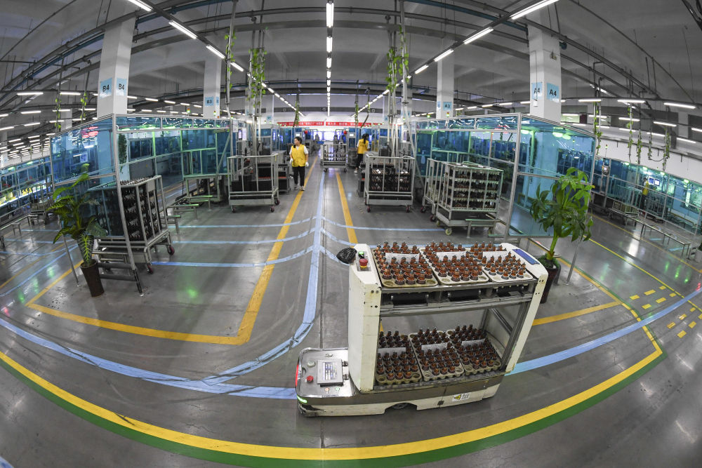 在江苏苏州一家企业生产车间,AGV小车在搬运物资(2020年9月18日摄)。新华社记者 季春鹏 摄