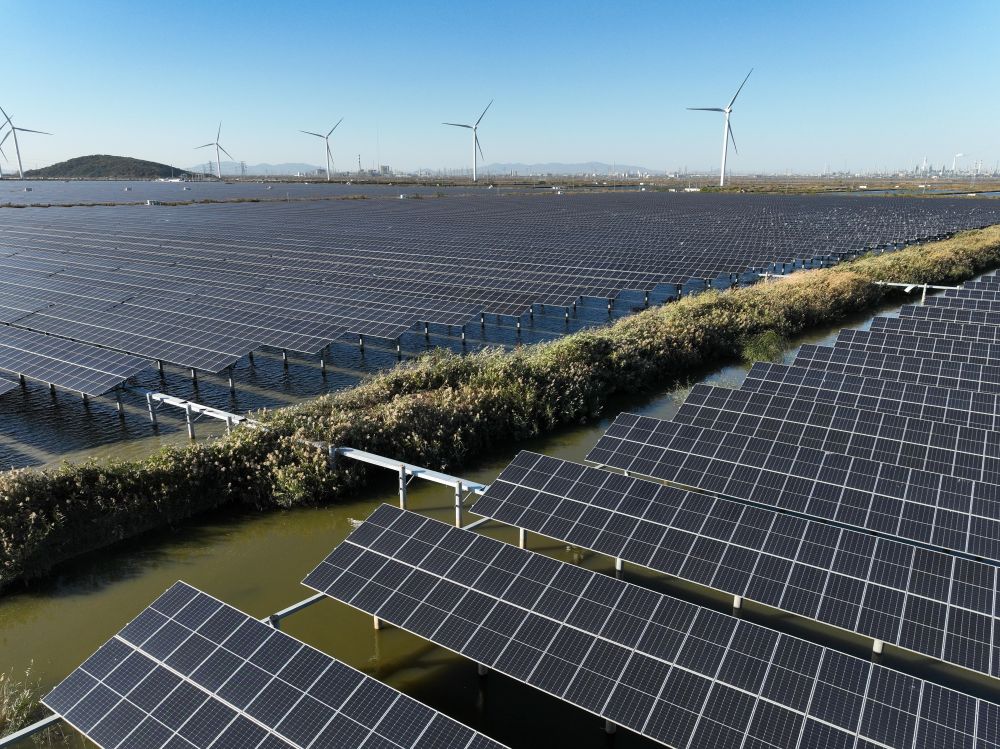 这是位于江苏连云港市灌云县圩丰镇洋桥村的渔光互补发电项目(无人机照片,2023年11月17日摄)。新华社记者 季春鹏 摄