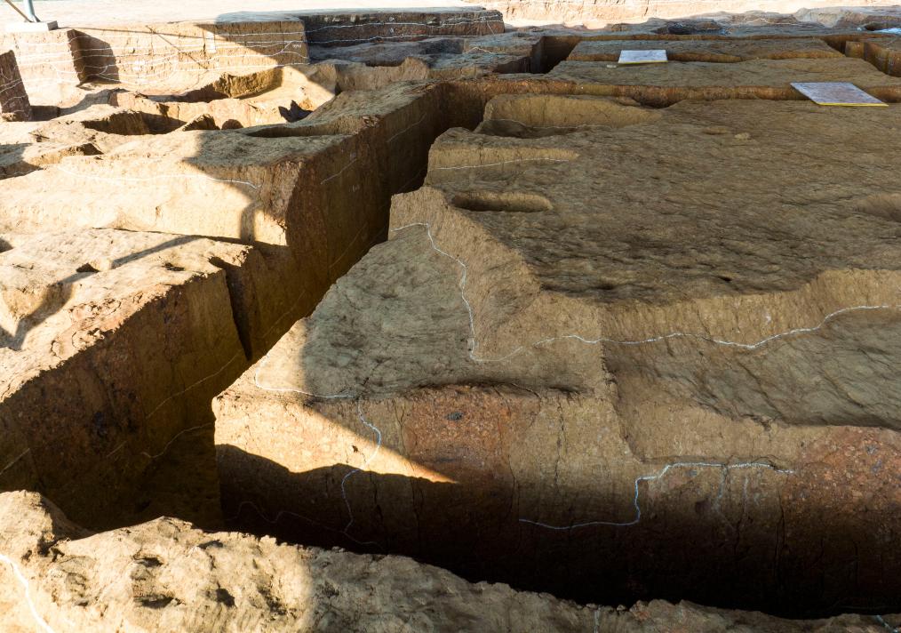 ↑这是12月4日拍摄的屈家岭遗址F38发现的磉墩。新华社记者肖艺九摄