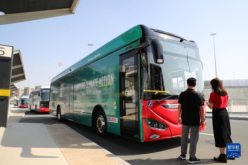 12月3日,中国苏州金龙公司的海格电动巴士停靠在联合国气候变化迪拜大会的摆渡车站点。新华社记者 王东震 摄