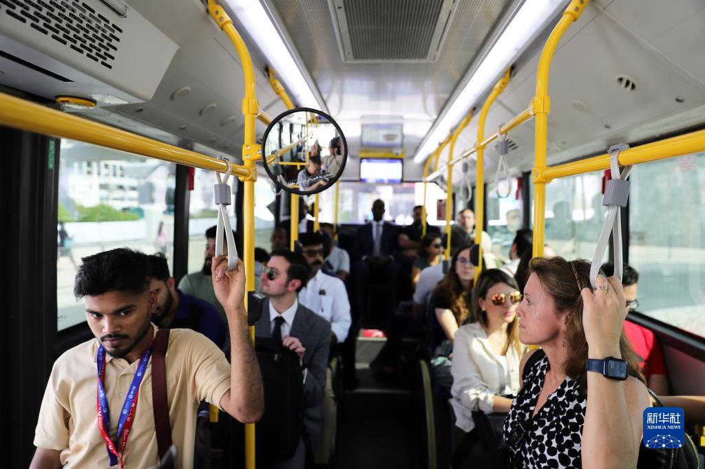 12月3日,在联合国气候变化迪拜大会,人们乘坐中国苏州金龙公司的海格电动巴士。新华社记者 王东震 摄