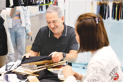7月19日,在美国纽约举办的第24届中国纺织品服装贸易展览会上,客商(左)在一家中国上海的企业展位选看面料。