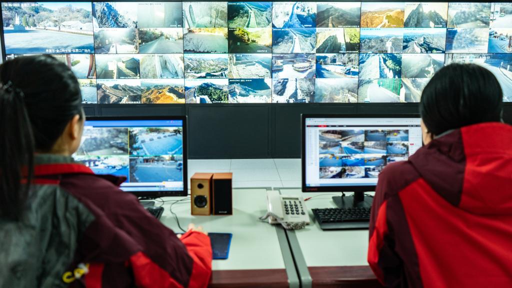 金山岭长城文物保护中心工作人员在监控室实时查看金山岭长城景区内动态。(梁志青 摄)