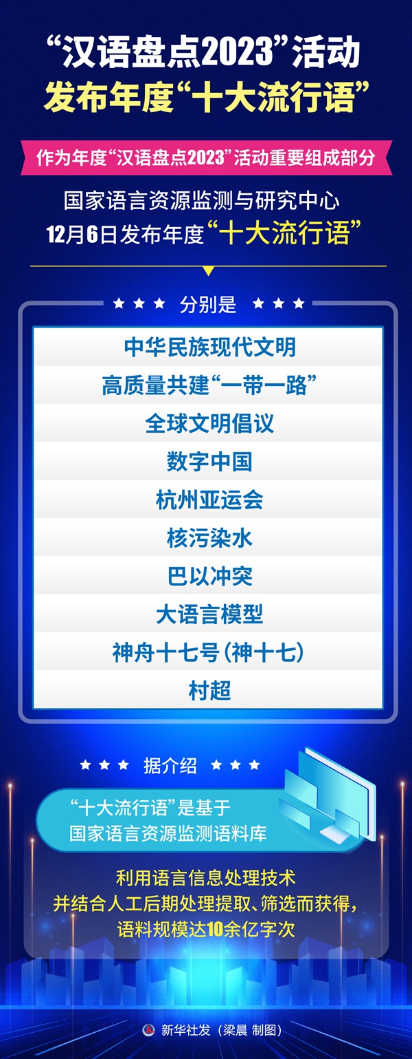 新华社北京12月6日电(记者史竞男)作为年度“汉语盘点2023”活动重要组成部分,国家语言资源监测与研究中心12月6日发布年度“十大流行语”,分别是:中华民族现代文明、高质量共建“一带一路”、全球文明倡议、数字中国、杭州亚运会、核污染水、巴以冲突、大语言模型、神舟十七号(神十七)、村超。