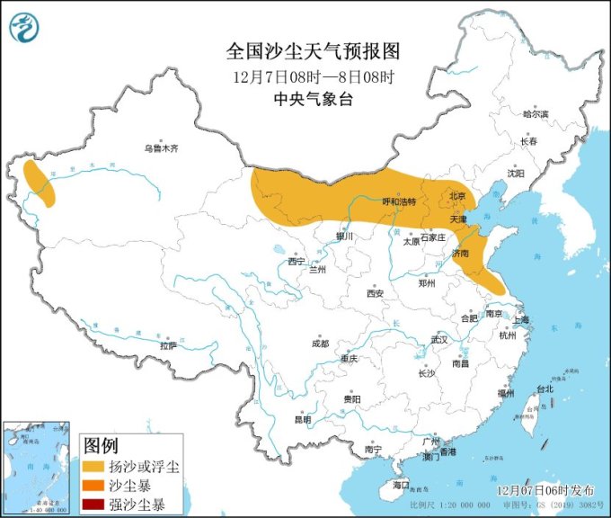 另外,7日,内蒙古中西部、甘肃西部、陕西北部、山西北部、北京、天津、河北中北部、山东西部、江苏北部等地的部分地区有扬沙或浮尘天气。