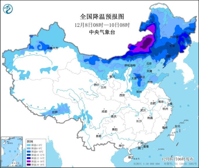 人民网北京12月7日电 (记者温璐)据中央气象台消息,受较强冷空气影响,今晨内蒙古东部、东北地区、华北、黄淮、江淮等地出现4~8℃降温,黑龙江中东部、吉林中东部、辽宁中部等地降幅达10~15℃,黑龙江哈尔滨和七台河、吉林白山局地降幅超过20℃。